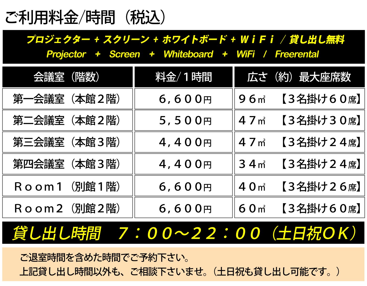 ※プロジェクター+スクリーン+ホワイトボード1台+WiFiは無料でお使い頂けます!